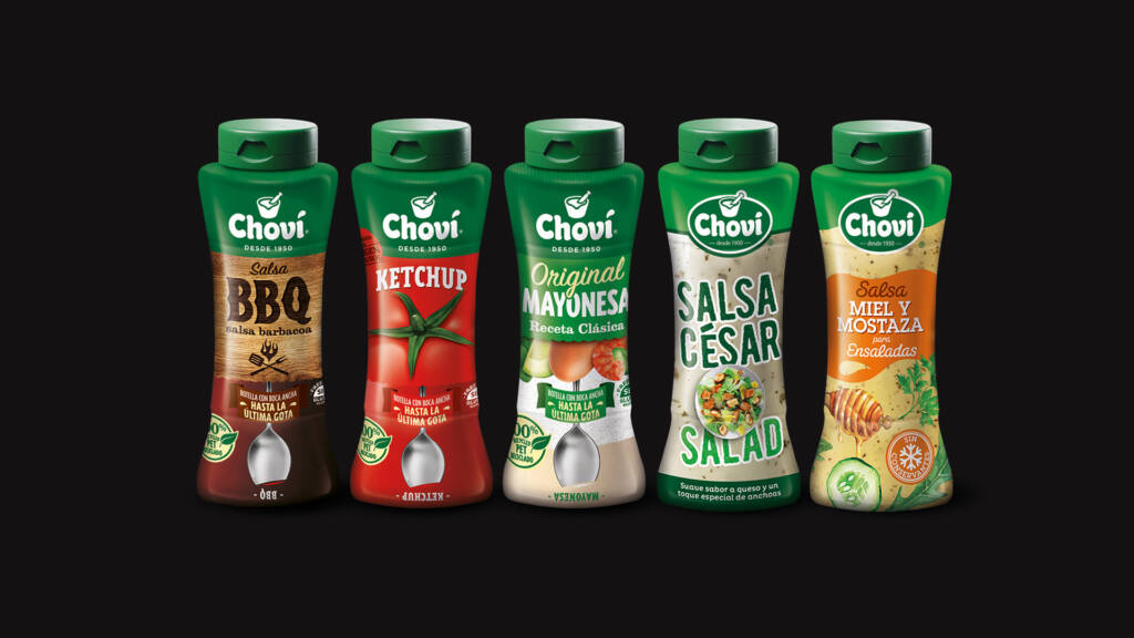 Cuando un director de marketing con el que has colaborado durante años deja su empresa y nos lleva consigo a su nuevo proyecto, es el mayor cumplido que se puede recibir. Exactamente eso pasó con Choví, y siempre apreciaremos el diseño que creamos para las salsas de Choví.