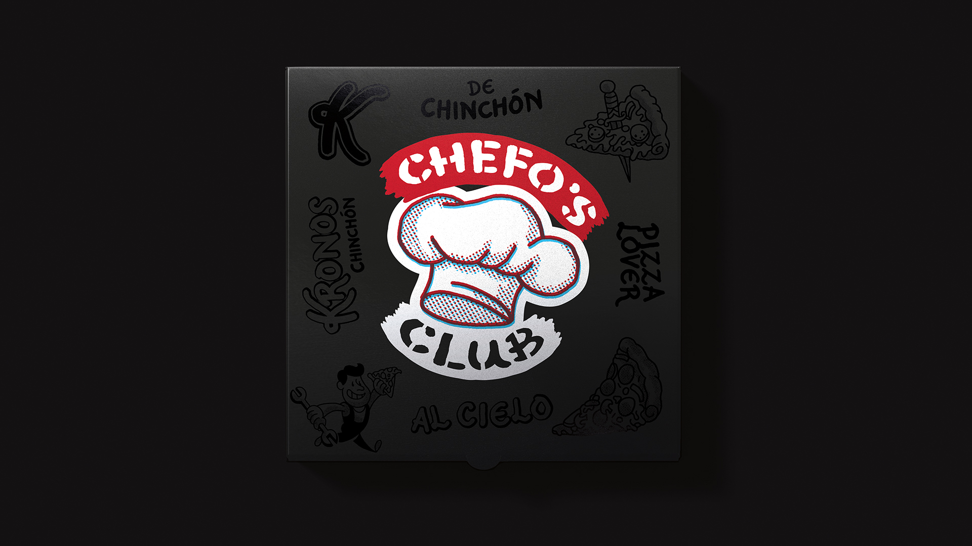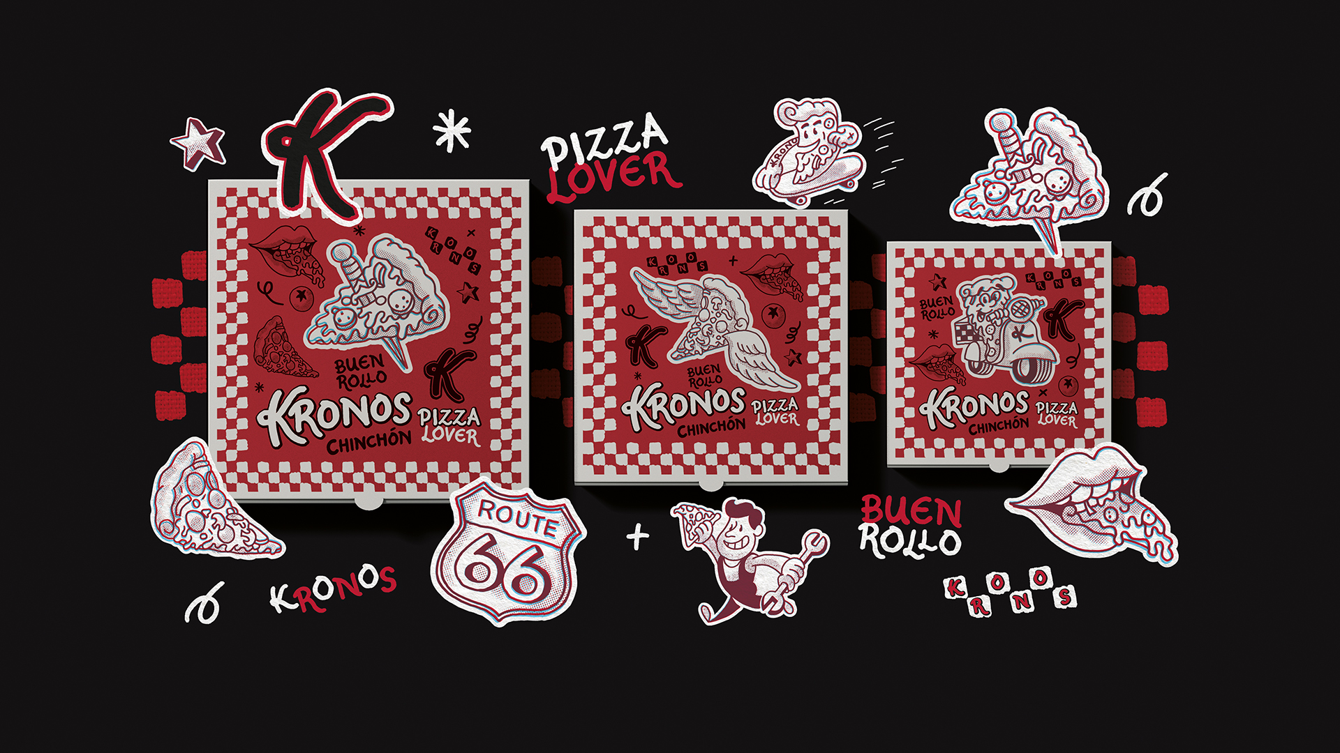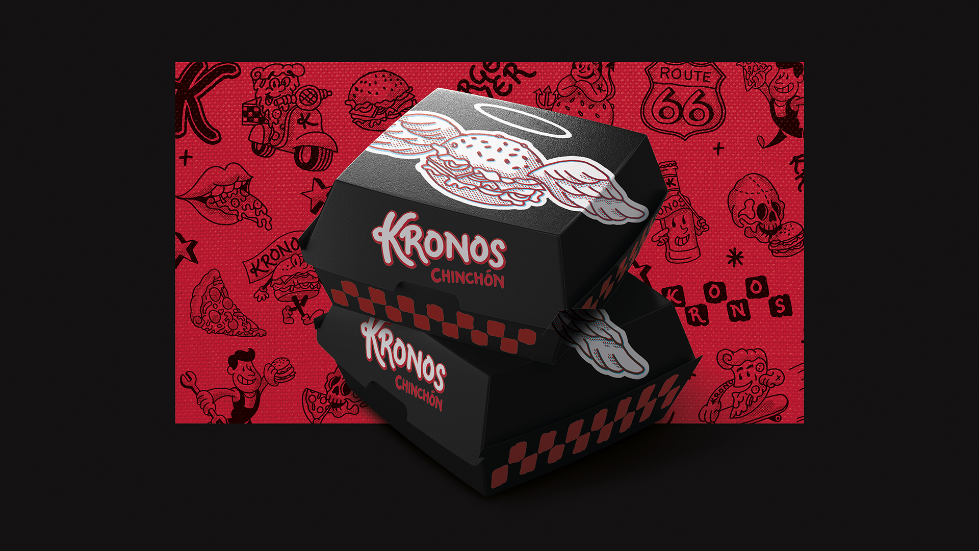 Nuestro proceso creativo partió de las ilustraciones presentes en su establecimiento, a las que dotamos de una nueva vida mediante una reinterpretación de estilo retro y desenfadado. Inspirándonos en la estética de la cartelería americana clásica (diners), desarrollamos un universo gráfico divertido y dinámico. La elección de una paleta cromática en rojo y negro aporta la fuerza visual necesaria para elevar el posicionamiento de la marca, transformando a Kronos en una propuesta con una clara identidad gourmet.