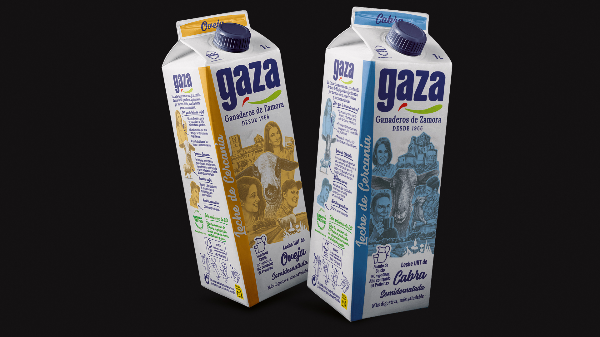 Tras el rediseño de la gama principal de Leches Gaza, abordamos el desafío de crear sus leches de cabra y oveja. El objetivo era dotar a estos productos de una personalidad premium que honrara su origen y diferenciara su valor añadido en el lineal.